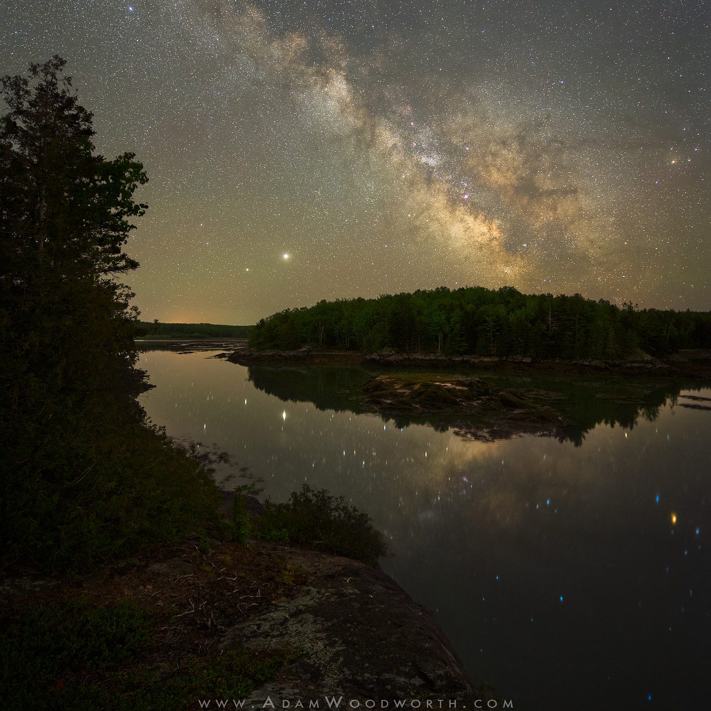 The Milky Way, Jupiter, and Saturn reflect in a cove on a calm night on the coast of Maine. The lack of wind made for some amazing mirror-like reflections. It’s hard to tell in the photo, but I’m actually standing on a cliff about 20 feet above the water.